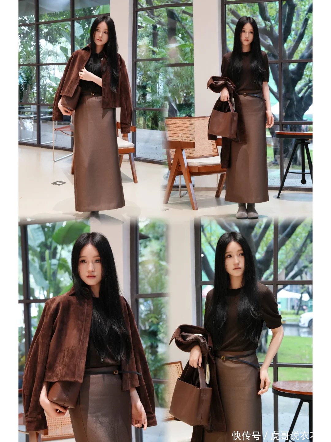 深棕色的针织过膝半身裙,以其独特的材质与剪裁,成为冬日里的时尚焦点。它既能彰显穿着者的个性与品味,为整体造型增添一抹亮色。搭配大地色系毛衣或大衣,不仅保持了整体色调的和谐统一,还能通过材质的对比,展现出丰富的层次感与视觉冲击力。