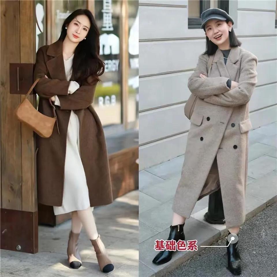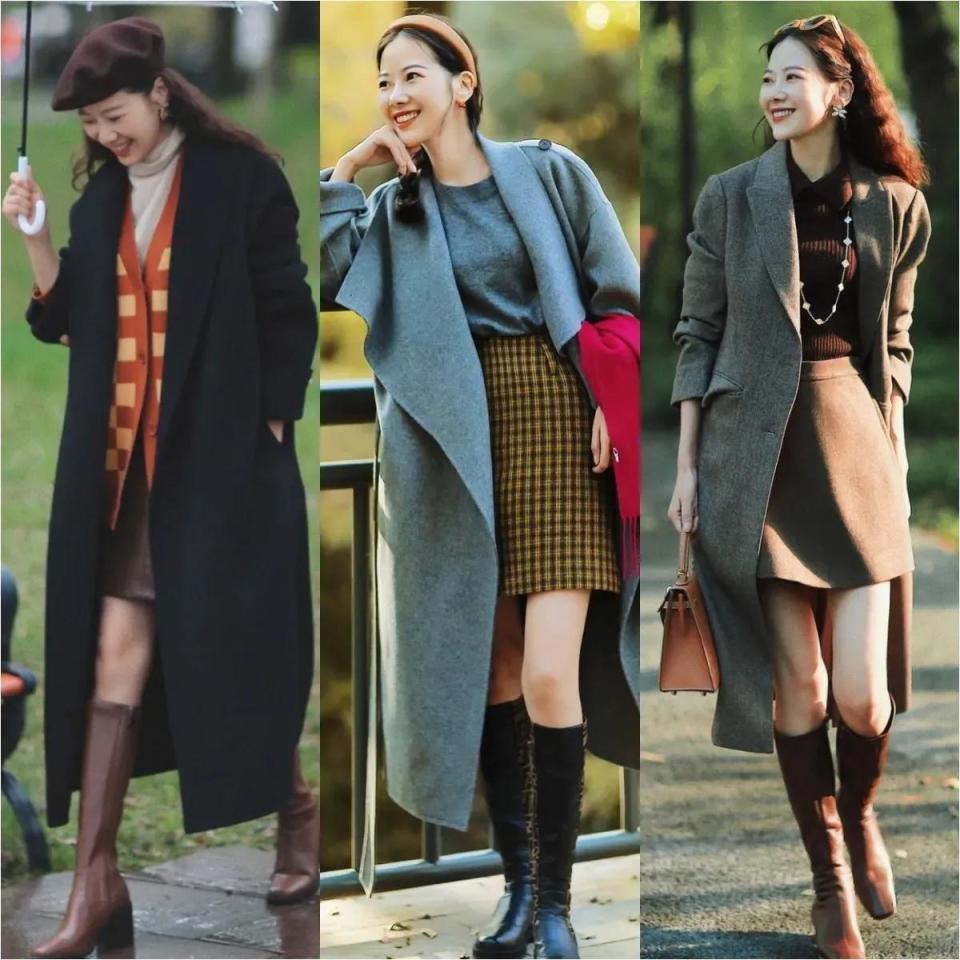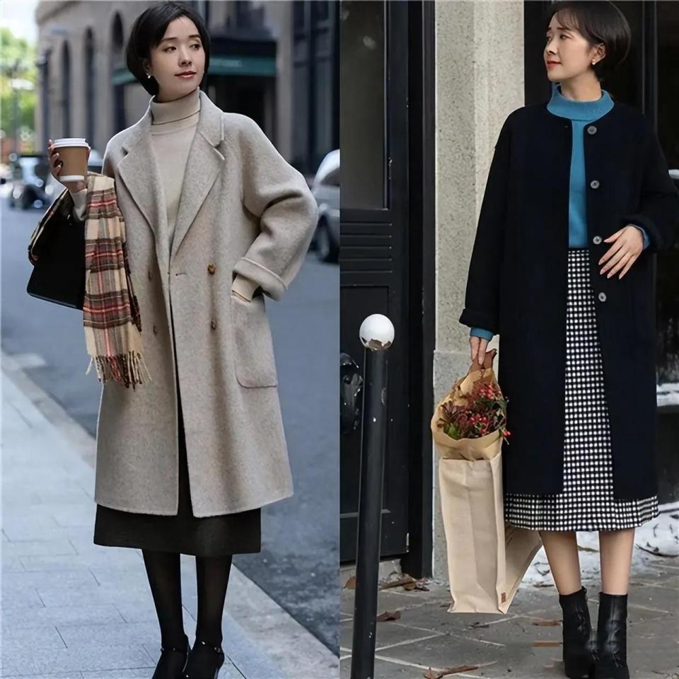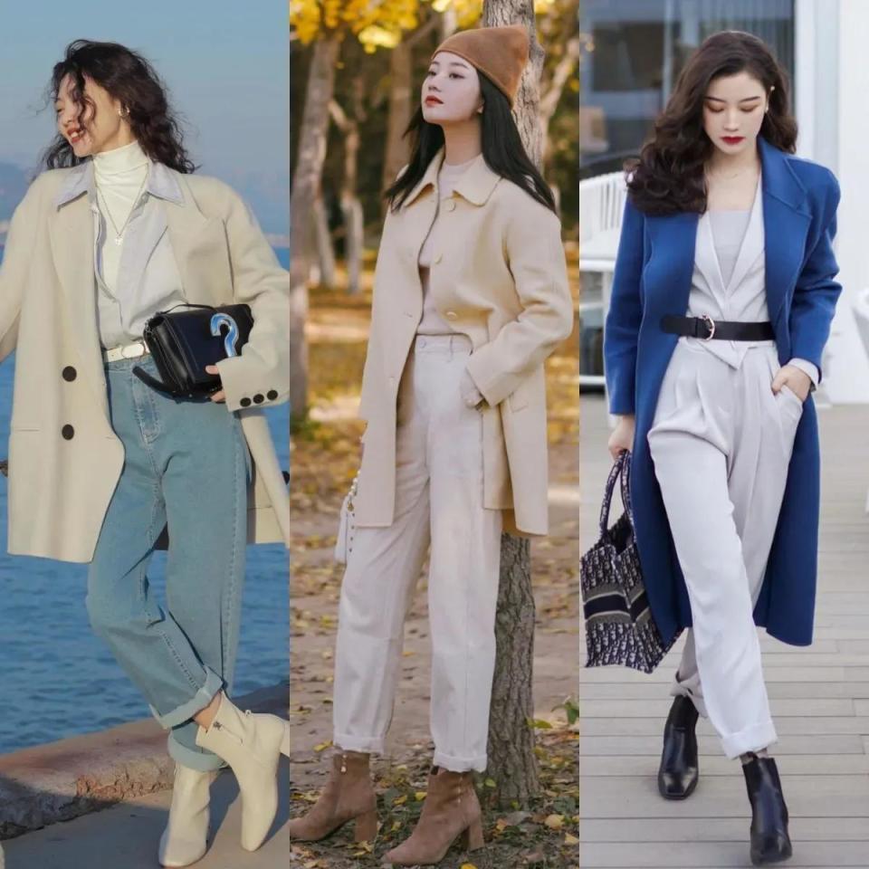 咱们看下面这三款大衣外套领子是不同的,第一款是圆领的大衣,第二款是大翻领的大衣,第三款是奶奶领款式大衣。不同的款式,不同的搭配,穿出来的效果,天壤之别。比如说第一套是圆领大衣,里面内搭一款半高领的毛衣,下半身选择开叉的半身裙,脚踩一双浅口单鞋,里面内搭一件白色的保暖打底裤,这样的穿衣打扮优雅得体。