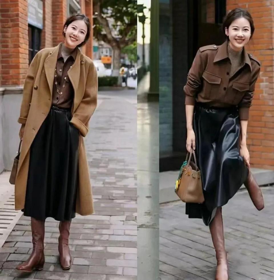 正常情况下来说,在这个冬季,我个人推荐选择半身裙的时候,一定要盖过膝盖,到小腿肚的位置最佳,例如下面这位博主选择大地色的大衣外套里面加上一款咖色的衬衫,再叠加一件毛衣,下半身选择黑色的皮质半身裙,脚踩一双棕色的中筒靴,这样的穿衣打扮很大气。