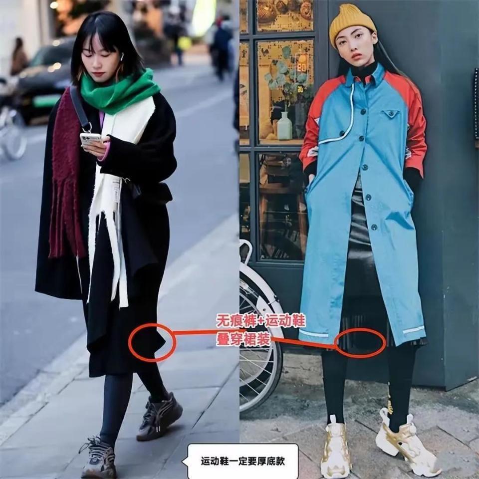 如果你确实想要展现自己修长笔直的美腿,这个时候我们可以换一种穿搭思路,例如下面右边的这位素人的穿衣造型就很不错,一件拼接色的外套内搭一件黑色的皮质半身裙,里面再加上一条保暖舒适的无痕裤,脚上踩的一双运动鞋,这样的穿衣造型就很个性,很适合00后的美少女,渐见穿搭。