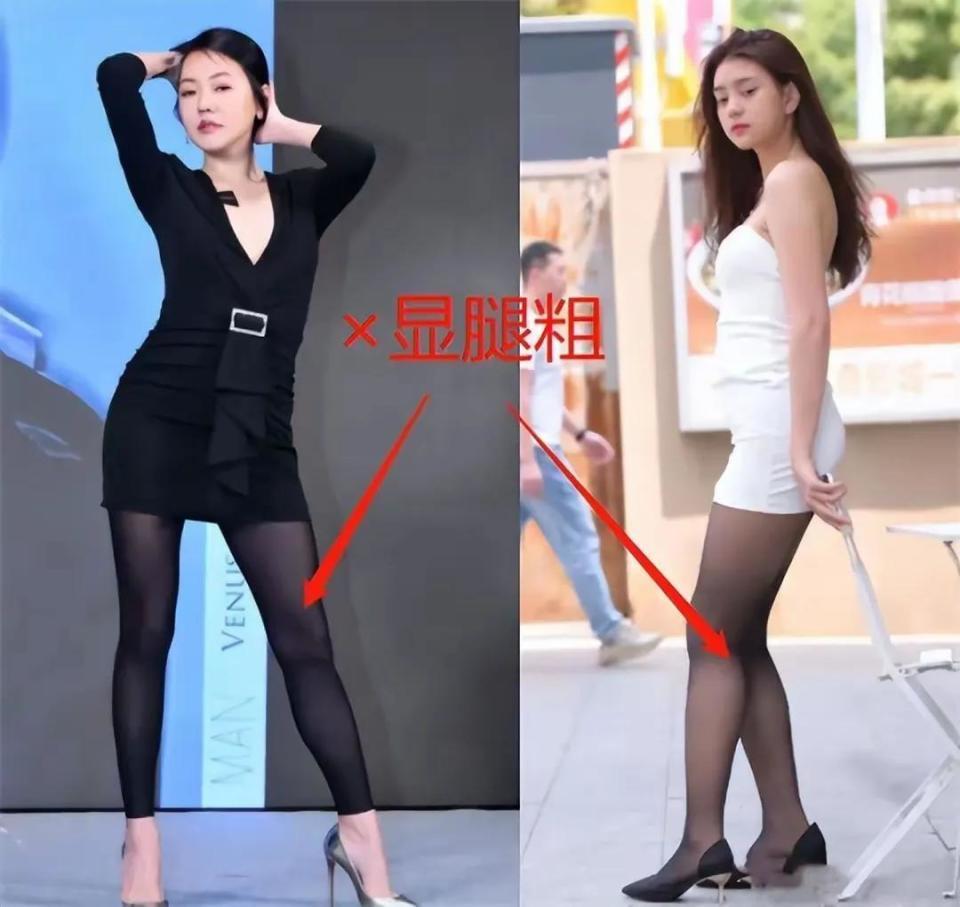 例如你里面内搭的是裙子,这个时候可能你会选择紧身的裤子,或者是像下面这两位一样用丝袜来作为内搭,可能初衷是想要展现自己凹凸有致的身材,但是这样会显得腿粗,土气廉价,就算是你加上了非常高级显贵的大衣外套,也很难把这些缺点遮住。